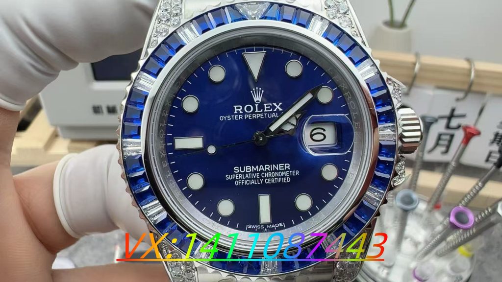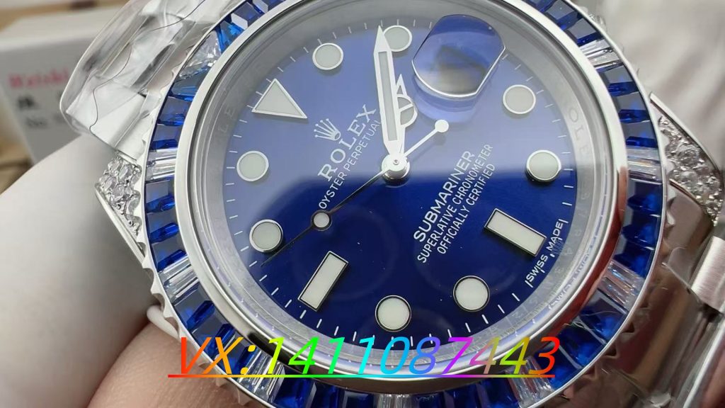 表盤部分同樣可圈可點。六點鐘位置設有隱藏式安全標簽,為腕表增添了幾分神秘色彩。表面雕刻清晰,藍寶石水晶玻璃具有極高的透光度,勞力士標志立體感強烈,充分彰顯了 C 廠對細節的極致把控。